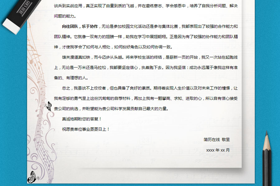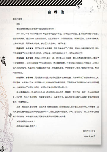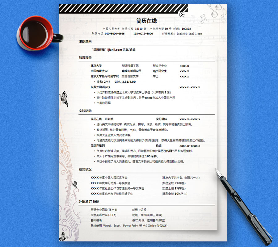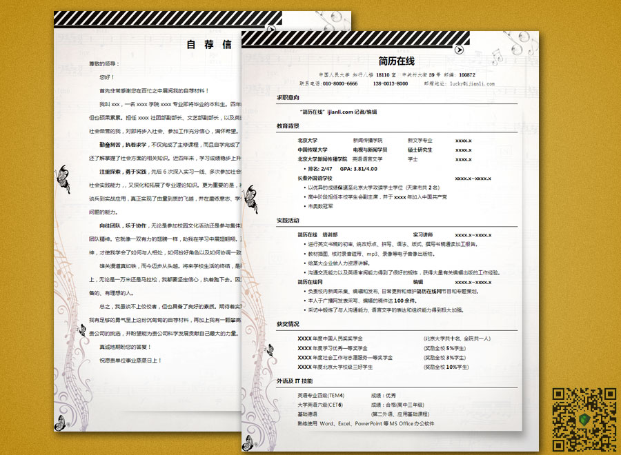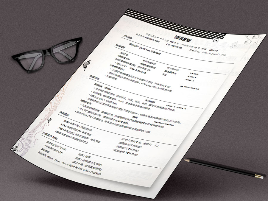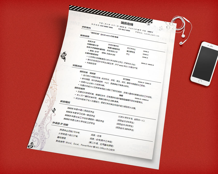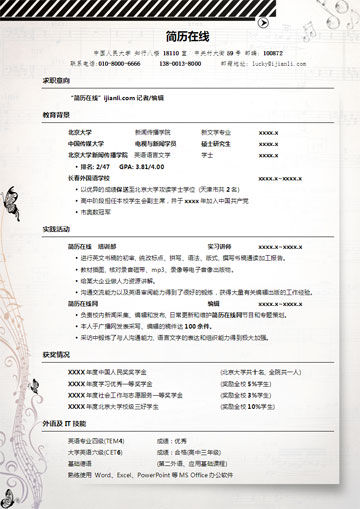 比较适合音乐/表演类专业使用的个人求职简历模板,五线谱和蝴蝶的图案非常贴合音乐精灵这个主题。音乐与精灵,两个充满梦想力的词汇,有无限的想象拓展空间。